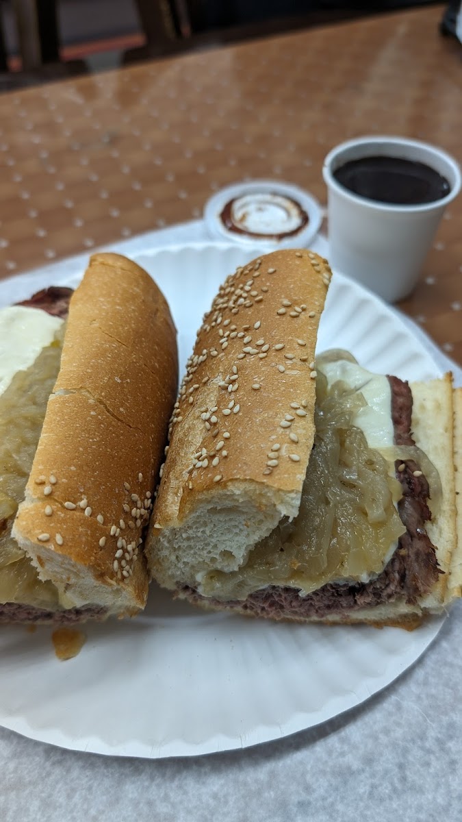 Very small place. If you're not looking for it it is easy to miss. Glad I did not miss it!!! It's a small establishment, clean with indoor seating (3 tables) and outdoor (two tables) as well. We ordered the classic roast beef on a The sandwich was packed (not too thick) with savory, juicy & tender roast beef topped with caramelized onions that perfectly complimentary the beef. It really was a bite of delight. The guys at the counter where very nice and quick. We will definitely return
